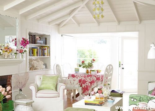 (2)野花是法式田園風(fēng)格最好的配飾,因?yàn)樗钪苯觽鬟_(dá)了一種自然氣息,有一種直接觸摸大地的感覺(jué)??蛷d垂落在窗臺(tái)上的優(yōu)雅的花布窗簾,粉綠色的墻面,以及臥室淡紫色的墻面,相同色系的小碎花家紡和窗簾等都讓我們的心情豐盈而快樂(lè)。