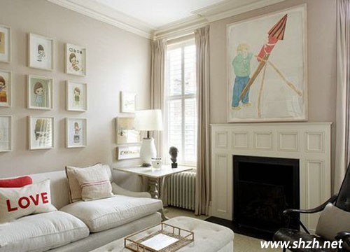 代替一整幅的壁畫,用多個小相架裝飾單調(diào)的墻壁,還能展示新婚夫婦的結(jié)婚照,讓客廳縈繞著甜蜜。紅白搭配的抱枕起到隔開大片白**塊的作用,讓房子達(dá)到冷暖平衡。
