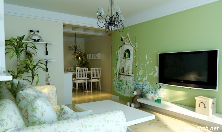 這一款田園風格的客廳裝修設計,不僅采用了田園風格清新淡雅的主要思想,更是融入了小清新風格的元素,顯得整個客廳在陽光光線的照射下,顯得更加明亮,綠色的背景墻左邊畫有城堡的圖案,更是體現(xiàn)出這家戶主喜愛大自然的喜好,碎花樣式的沙發(fā),配上綠色的植物,使得整個客廳空間不僅體現(xiàn)出淡雅不失品位,而且又充滿著濃濃的清新氣息