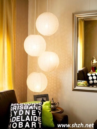 圓形的頂燈線條分明,且結(jié)構(gòu)簡(jiǎn)單。用棉布纏繞后這個(gè)球狀造型,高低不同而錯(cuò)落有致的懸掛在沙發(fā)區(qū)頂部,搭配上客廳里同樣以棉質(zhì)為主的布藝靠包,將樸實(shí)無華的自然主義情節(jié)展露無遺。