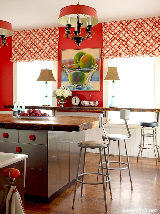 除了衛(wèi)生之外,廚房色調(diào)還和人的食欲有關(guān)。廚房的顏色當(dāng)然就會(huì)在潛移默化中對(duì)人發(fā)揮影響,盡管你不一定意識(shí)的得到。事實(shí)上,很多顏色都和人的情緒有關(guān),能調(diào)動(dòng)起人相應(yīng)的情緒。不管什么情緒被調(diào)動(dòng)起來,人的食欲都會(huì)受到抑制,只有白色,最干凈、最純潔,和任何情緒都沒有關(guān)系,所以才不會(huì)對(duì)食欲產(chǎn)生干擾。而且,白色非但不能喚起人的情緒,反而有助于人各種情緒的平伏。通常,白色象征的就是平靜,什么情緒都在漸漸放送、漸漸淡化。白色廚房的真實(shí)含義,是要我們學(xué)會(huì)釋放一切不好的情緒,找回屬于自己的平靜與健康。所以我們可以用用櫥柜打造現(xiàn)代色彩廚房。那么我們來分別說說這些色彩的特色,和可以帶給我們的心情。藍(lán)色充滿夢(mèng)幻的色彩,始終保持清澈、浪漫的感覺,櫥柜在這樣的空間里,顯得純潔可愛、惹人遐思。藍(lán)色在自然的掩映下,更加清新淡雅,富于裝飾味道,特別適合工作緊張的白領(lǐng),讓喧囂的心靈靠岸寧靜的港灣。藍(lán)色與其他顏色搭配,也會(huì)起到意想不到的效果。綠色輕松舒爽、賞心悅目的色彩。綠色是永遠(yuǎn)用不完,永遠(yuǎn)不會(huì)讓人感到厭煩的主題,因?yàn)樗拿恳稽c(diǎn)變化,都對(duì)應(yīng)著自然給人類的印象,所以綠色適合所有喜歡它的人。從淡綠轉(zhuǎn)化為灰綠,然后暗紫,完成室外到室內(nèi)的過渡,對(duì)應(yīng)了人的視覺對(duì)空間的自然反應(yīng)。淡綠如田野的地板,黃色如秋葉的柜體,墨綠如松針的臺(tái)面,構(gòu)成一幅自然景色,使人心情豁然開朗。淡綠與淡藍(lán)的配合,則使廚房充滿盎然生機(jī)。生活在淡綠的空間里,夢(mèng)都是清新的。明快而錯(cuò)落的綠,讓人仿佛來到青山翠谷。紅色熱情奔放,充滿喜慶的色彩。年輕的新婚夫妻采用紅色最為貼切,不僅能體現(xiàn)出主人強(qiáng)烈、大膽的個(gè)性,更能展現(xiàn)青年生機(jī)勃勃的朝氣,顯示華貴。另據(jù)測試,紅色能使食欲達(dá)到高峰。紅如朝陽,白如軟玉的紅白相間組合,利用白的溫和稍稍沖淡紅色造成的單調(diào)感覺,使整體更富變化,更有生氣。紅與黃的搭配有一種壓得住的熱烈,輔以老式家具喜慶吉祥的用色手法,會(huì)使櫥柜顯出一派欣欣向榮的新氣象。白色純潔無瑕、一塵不染的色彩。以白色為主調(diào)的櫥柜呈現(xiàn)樸素、淡雅、干凈的感覺,對(duì)于喜歡潔凈、安靜的人,無疑是最好的選擇。白與黑這一對(duì)比色的搭配,會(huì)制造出一種單純的沉穩(wěn)效果,沒有什么可以攪亂心神的地方。白與任何顏色搭配,都會(huì)產(chǎn)生意外的感覺。