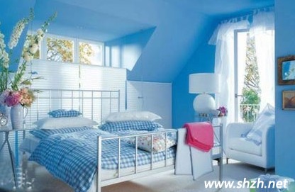 地面:純白色木地板與藍(lán)色墻面非常和諧的搭配在一起,在地板選購(gòu)上一定要實(shí)木地板才能達(dá)到預(yù)期的效果。