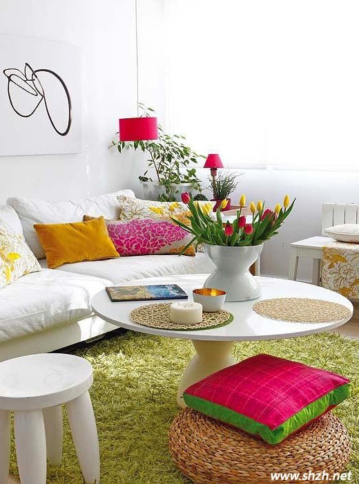 地毯的選擇,很可能也決定了這片區(qū)域的風格走向,鮮艷的用色、地毯和家具的搭配也非常重要。創(chuàng)意的客廳空間充分顯示出與眾不同的風格,對于略帶有鄉(xiāng)村風格的客廳來說,這片草色的地毯是很好的選擇,純凈的茶幾和沙發(fā)下鋪有這樣一塊地毯,局部氣氛立刻強化出來。而草色地毯的質(zhì)感以及顏色的簡樸味道,與布藝沙發(fā)的格調(diào)非常融洽,能讓自然氛圍更加濃郁。 靠墊激活色彩,在現(xiàn)代的家居生活當中,靠墊已經(jīng)不可缺少。它是色彩的精靈,是絕好的搭配用品,所以小清新也不能缺少了這些小精靈的點綴。溫馨的小清新風格裝飾品,在清新的基礎(chǔ)上給人充足的溫馨感,別有一番風味。茶幾上的小盆景,與角落里的綠色植物呼應(yīng),讓本來就生機勃勃的小小空間更加的迷人,還有什么可以阻擋我們對她們的喜愛。一本書,一杯咖啡,那種在咖啡吧才可以體會的浪漫,一樣可以搬回家!