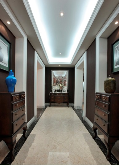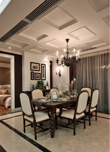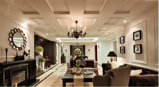 白色調(diào)和深啡色調(diào)為大對比色彩,加以簡約形態(tài)的暖色家具為中間色來諧調(diào),營造一種高貴雅致對比的深度感的空間;將歐洲新古典風格演繹成一種優(yōu)雅的平衡姿態(tài),含蓄、考究的家居空間。