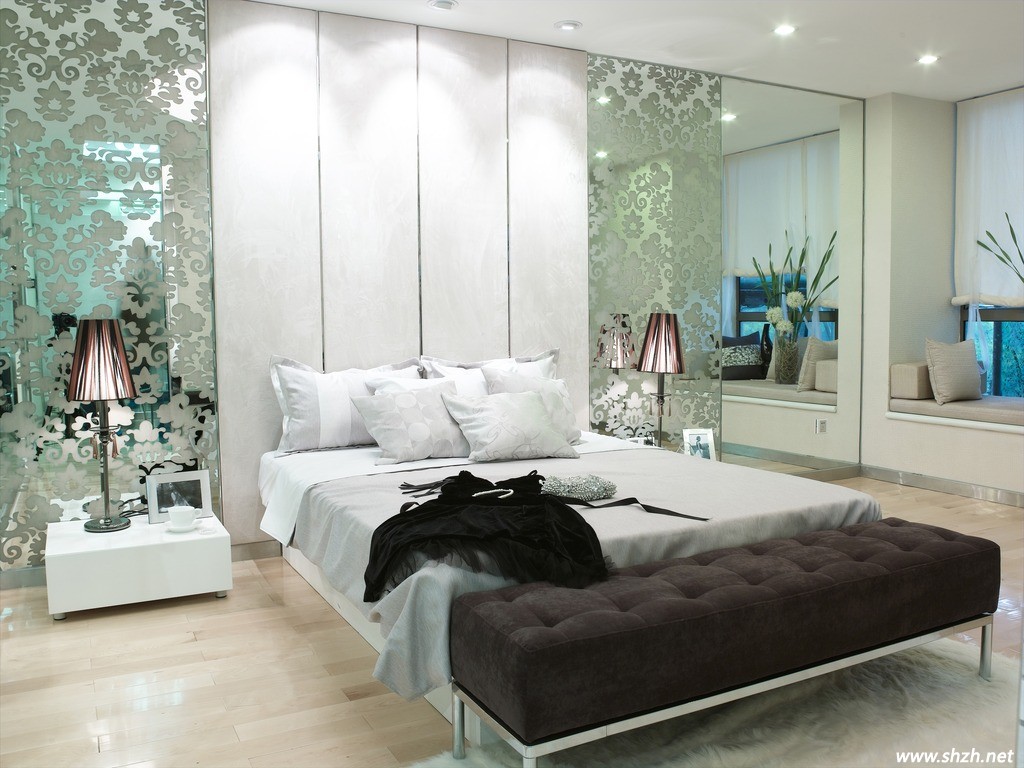 床是臥室的活動中心,所以應(yīng)當(dāng)擺放在房間的中部,并且通向床的道路應(yīng)盡量通暢,使其成為最方便接近的地方。如此放置使人感覺房間被床分成了兩部分,因而看起來更大一些。兩個床頭柜分置于床的兩邊。衣柜則放置在床的對面,這樣既對稱,又能非常方便地看電視。