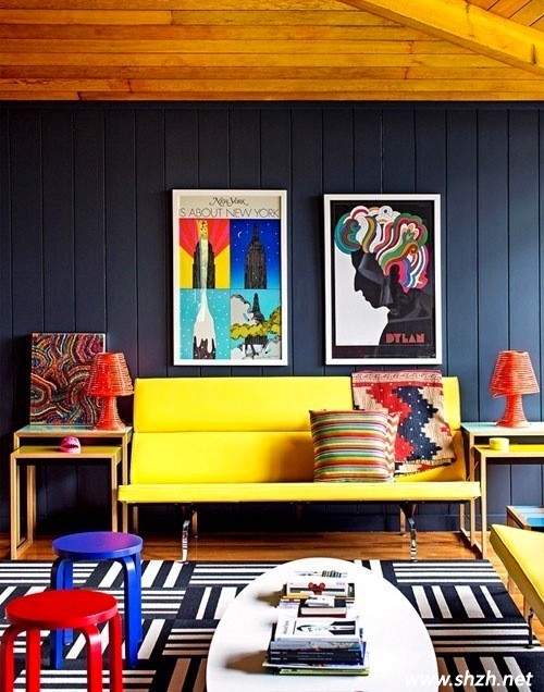 四、組合式:這是一種組合式的裝飾方法,由一組畫構(gòu)成裝飾效果,裝飾中心是一幅主畫,這樣能起到突出中心、主次分明 的視覺效果。兩邊圍繞著裝點,物品可以多種多樣。這一組設(shè)計兩邊掛著中國瓷器,且全是青花裝飾,這樣比掛置五彩盆子更顯示了優(yōu)雅。下面是現(xiàn)代圖案,這些圖 案沒有取工整的人物畫或山水畫,這是對的,否則與青花圖案的工整對沖,組合上就不嚴密。這一組裝飾融合了西方與中國傳統(tǒng)的風格。顯示了主人中西兼容的開放 式心態(tài)。同時也顯示主人的不俗,既沒有完全媚外,也沒有一味地厚古。