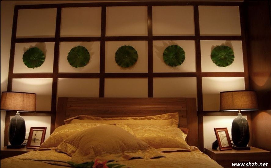 以五片荷葉為背景的背景墻嵌入周?chē)膶?shí)木格,再搭配床頭柜和臺(tái)燈,別有一番韻味。邊桌、臺(tái)燈,壁掛,都有著傳統(tǒng)的亞洲風(fēng)格特色。南亞風(fēng)情標(biāo)志性