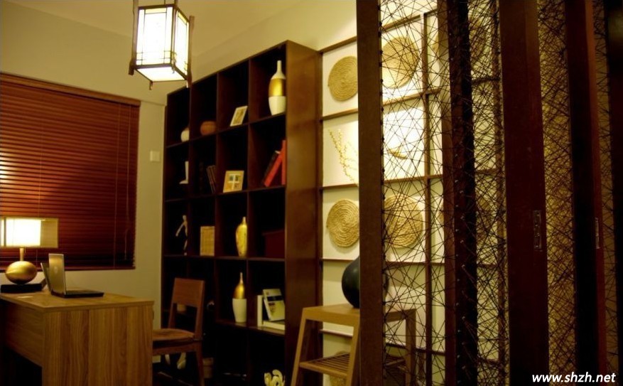略有些復(fù)古風(fēng)格的書(shū)房,家具也有東南亞風(fēng)格的特點(diǎn)。