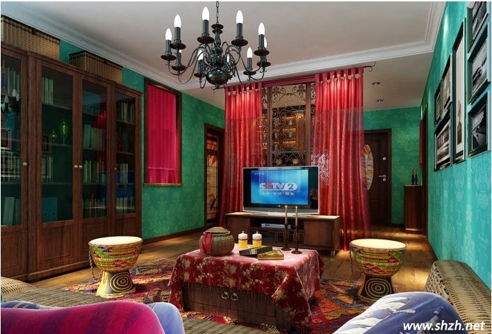 圖二:小小的客廳中細(xì)細(xì)看來(lái)幾乎是融進(jìn)了東南亞風(fēng)格中所有的元素,比如:木石的組合,砂巖的裝飾以及花紋墻紙等,這些可都是東南亞傳統(tǒng)風(fēng)格中必不可少的元素。當(dāng)然這個(gè)客廳里最吸引眼球的還要數(shù)電視背景墻了,沙質(zhì)的紅色帷帳做成的背景墻異域風(fēng)情突出,電視柜又是時(shí)尚的英倫風(fēng)尚,古典與現(xiàn)代的完美搭配
