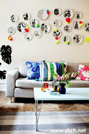 貼出個性:你的家里多多少少會有一些少有破損的盤盤碟碟,對于這些有缺口的盤子要是繼續(xù)使用的話,會非常的不安全,但是扔了話又覺得太浪費了,所以日積月累,你家總避免不了存了很多這樣有缺角的碟子,那么現(xiàn)在你就把他們?nèi)磕贸鰜頀煸趬ι习?,重新噴上漂亮的色彩,隨意的掛在墻上就是極具個性的沙發(fā)背景墻了。