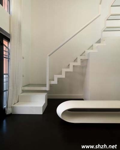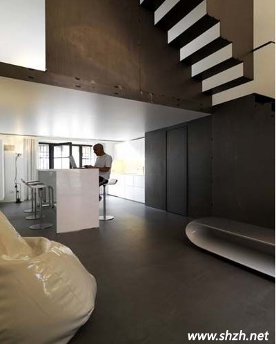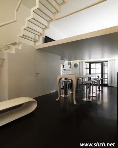 上海裝潢網(wǎng):圖一中的三幅是這個LOFT的第一樓,南北通透的房型最好布局了,設(shè)計師把廚房安放在進門處,讓每一位來者第一時間感受到家的溫馨,轉(zhuǎn)身即到的餐廳中,餐桌采用吧臺的造型,時尚美觀,另外大家看見餐桌后的白色櫥柜了嗎?即使有很大的空間,設(shè)計師仍然沒有浪費樓梯下的大好空間,在此打造了一個容量巨大的收納室。最后順著餐廳走過,一樓的另一端墻壁也完全打開,門外的陽臺也是一道風(fēng)景線。