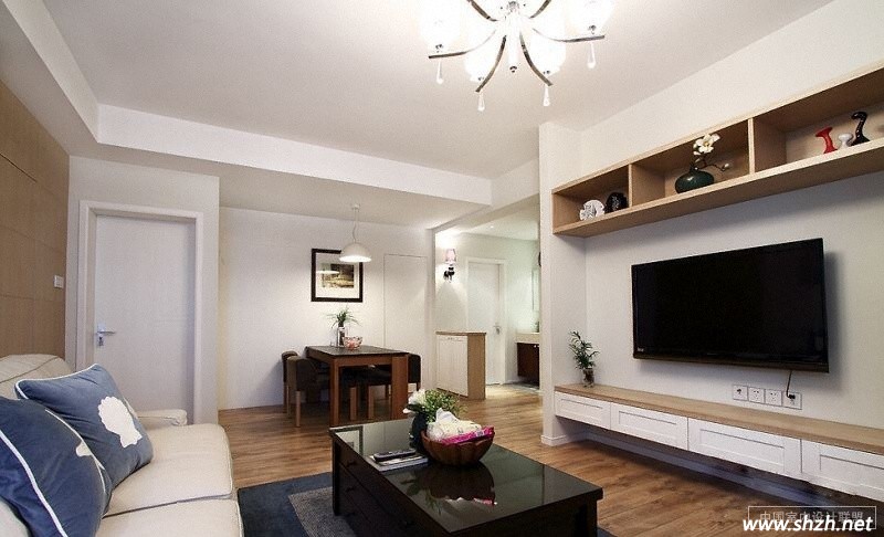 本套著重要說的就是地中海與日式混搭的客廳裝修,白色與木色的加入讓人們?nèi)缤蒙碓谏盍?,絕對讓家變成“避暑山莊”。先來看看客廳的全貌,白色的沙發(fā)上藍(lán)色的布藝成了畫龍點(diǎn)睛的一筆,白色與木色結(jié)合的電視柜在此點(diǎn)明地中?;齑钊帐降闹黝},大家注意地面的原木色地板,這才是真正的精華。