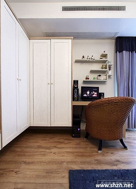 從這幅圖中我們發(fā)現(xiàn)了客廳中的另一個玄機(jī),掩藏在衣柜盡頭的工作空間解決了小戶型中沒有書房的困擾,藤編的椅子清涼無限,白色的衣柜與白色的情面及沙發(fā)想照應(yīng),美妙的空間中,木色的茶幾也一個亮點(diǎn),帶有三層抽屜的茶幾,典雅大氣。