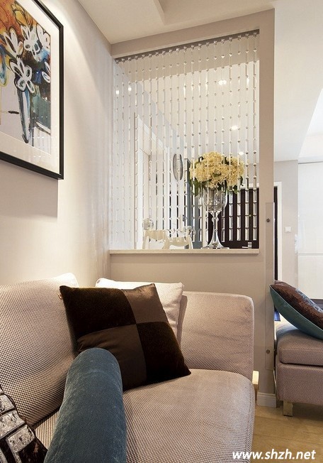 鏤空隔斷的設計出了上面的兩個創(chuàng)意,水晶幕簾也謂是一道搶眼的風景線,透明的水晶簾與白色墻壁給人一種夢幻的感覺,加上玄關鞋柜上放置的透明玻璃花瓶與亮黃色的鮮花,室內(nèi)的一切都蒙上了童話般的色彩。