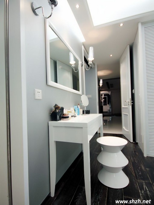 臥室與衛(wèi)生間之間僅用一面墻隔開,而中間則設(shè)置成一個梳妝臺,純白色打造,造型可愛的凳子給單調(diào)的空間帶來了許多的樂趣。黑色的木質(zhì)地板,莊重古典的氣質(zhì),古典與現(xiàn)代的完美結(jié)合,創(chuàng)造了一種意義的合成,一種立體的美學(xué)合成。
