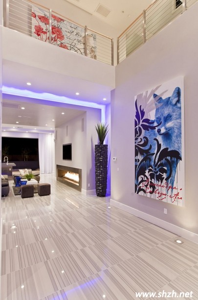好一派奢華景象,白色的居室空間,寬敞明亮,沒有過多的線條,很簡約的設(shè)計(jì),在這里,找不到繁瑣雜亂的空間,有的只是簡約帶來的舒適感。雖說簡約,卻一點(diǎn)也不簡單。紫色的吊頂,是那樣的迷人,那樣的夢幻,紫色給我們的感覺就是浪漫的代表,戀人之間,共進(jìn)燭光晚餐的時(shí)候,適當(dāng)?shù)淖⑷胱仙臒艄?,肯定?huì)收貨滿滿的愛情。地板的鋪設(shè),非常有層次的感覺;而白色墻壁上的狐貍掛畫,給單調(diào)的墻面增添了樂趣,狐貍本身很邪惡,但是在這里,卻盡顯它幽默的風(fēng)采。