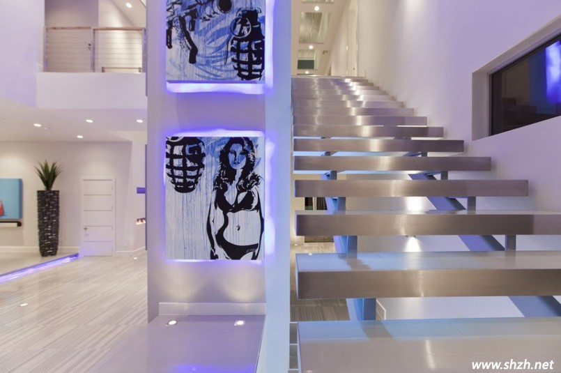 在樓梯口里,我們依然可以看到紫色燈光散發(fā)出來的魅力。奢華材質(zhì)打造的階梯,是不是很想上去欣賞樓上的風(fēng)景呢?那么,let’s go…