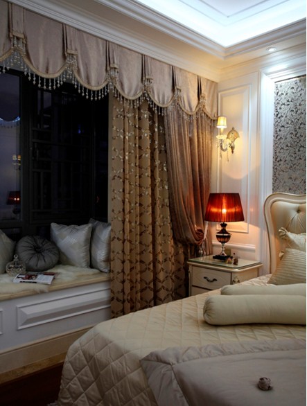凸窗臺(tái)也可有很好的利用價(jià)值;暗紅的臺(tái)燈增加了臥室的情調(diào);
