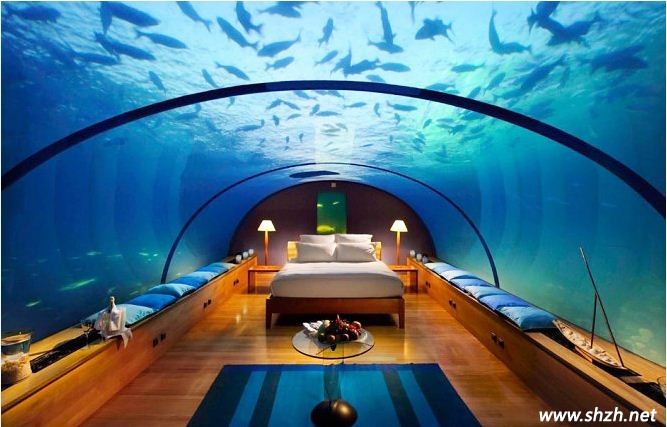 現(xiàn)代有些地區(qū)的游樂場(chǎng)都會(huì)有海底世界,很多人會(huì)去那里體驗(yàn)海底的生活,看著各種各樣的魚在水里盡情的游蕩,三五成群的非??蓯邸R苍S,你也會(huì)想擁有這樣的一個(gè)臥室設(shè)計(jì),這樣可以盡情的觀賞海洋的生物,夢(mèng)幻般的生活非常美妙。而今天,這樣的夢(mèng)想終于可以實(shí)現(xiàn)。看這款全玻璃裝飾的海底臥室,設(shè)計(jì)師巧妙的設(shè)計(jì)不得不讓人驚嘆,充分利用了自然環(huán)境的優(yōu)勢(shì),把自然景觀融入到臥室的設(shè)計(jì)中,仿佛徜徉在海底世界一樣,很奇妙吧!