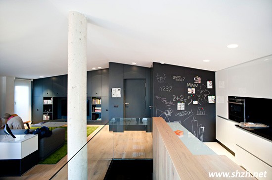 黑白為主色調(diào)的客廳空間,一點(diǎn)也不顯得枯燥乏味,莊重而典雅的感覺。而且前面的設(shè)計(jì),設(shè)計(jì)師考慮到空間的單調(diào)性,特地制作了墻面彩繪,可以在上面隨意的寫字畫畫,比如可以記錄下今天的生活心情或者工作內(nèi)容,亦或者教小孩讀書寫字,讓單調(diào)的空間瞬時(shí)變得活力十足,生動(dòng)而有趣。而且,也正好是這樣才會(huì)的方式,巧妙的將客廳廚房鏈接了起來,自然的過渡,創(chuàng)意十足。