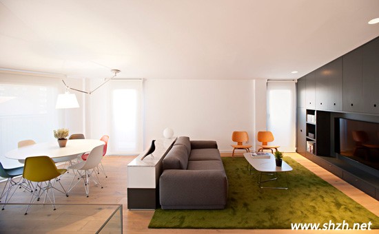 再來細(xì)看客廳的布局,一塊綠色的地毯就足以將客廳與餐廳嚴(yán)格區(qū)分了開來,非常巧妙的鋪設(shè),而且色彩的選擇上也恰到好處,不會(huì)顯得特別的生硬。灰色的沙發(fā),似乎略顯單調(diào),但是,如果用吧臺(tái)作為沙發(fā)背景墻,那就有趣多了,不僅可以作為隔斷,休閑之余,還能在此喝茶聊天,或者與愛人一同品酒,是那樣的充滿樂趣。