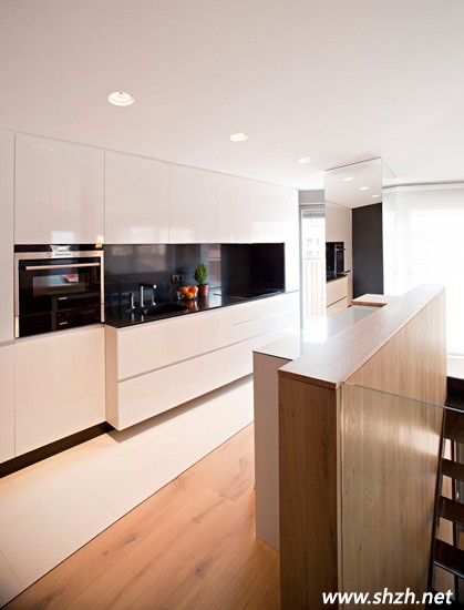 廚房的設(shè)計(jì)很簡約,黑白兩色的經(jīng)典搭配構(gòu)成了整體的櫥柜,很有現(xiàn)代的氣息。雖然簡約,卻不簡單,嵌入式櫥柜的電子爐設(shè)計(jì),每個(gè)細(xì)節(jié)都體現(xiàn)了科技化的家居氛圍。不簡單之處不止這些,我們看到另一面的櫥柜與樓梯巧妙的融合在一起,多種功能合一,創(chuàng)意無限。