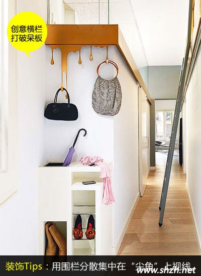 用木板做成的圍欄,向兩個方向延伸,從而避免了視線只停留在死角的局面,打破常規(guī),生硬感就從而得到了很好的改善,而圍欄下墜的水滴形狀掛鉤,創(chuàng)意無限,起到了很好的裝飾作用,同時也避免了呆板的直線效果,非常優(yōu)美。