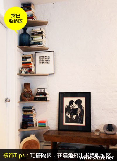 這款設(shè)計的亮點(diǎn)在于——再小的空間,也會有驚喜。采用三角形隔板搭配出來一塊書籍收納區(qū),讓每個空間都有利用的價值,并且還能憑空增添出一塊書房,這便是家居搭配的魅力和價值。