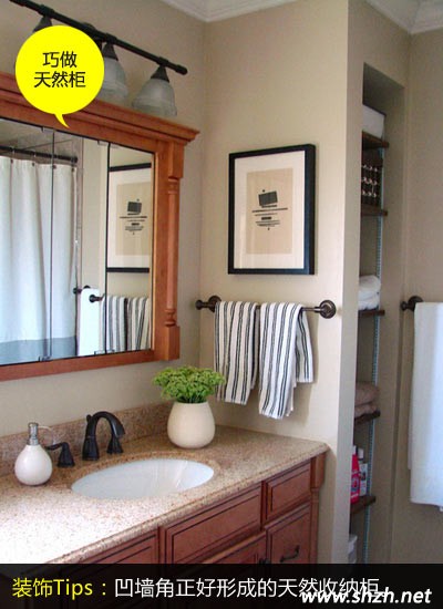 凹墻角其實(shí)就是常見的格局硬傷,在空間的銜接處空余出來小空間,也許很多人并不在意,其實(shí),這樣的凹陷空間可以制作成一個收納區(qū)域,比如洗手臺墻體和承重墻體之間的凹墻角被主人巧妙的做成了盥洗收納柜,不僅實(shí)用,還使得空間看起來更加的整齊美觀,優(yōu)雅大方。
