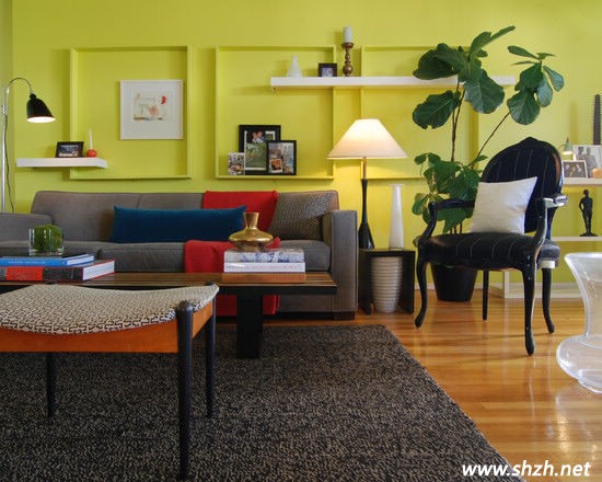 方案四:活潑的翠綠色墻壁,沉穩(wěn)的咖色沙發(fā)與低碳,典雅的歐式公主椅,每一件事物間好像都獨立的存在,卻又和諧的融在一起。沙發(fā)背景墻的設計非常有個性,鏡中鏡、框中畫,這是設計師的獨具匠心。畫框造型的硬裝為其中的照片提供了擺放地,這一切都是相輔相成的存在。