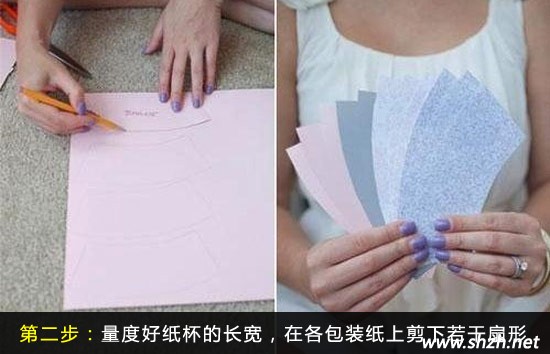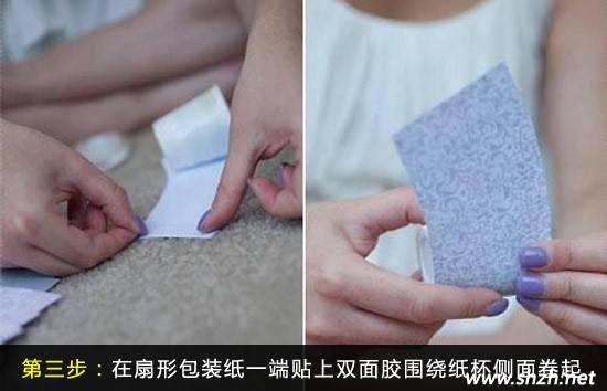 第三步,扇形的包裝紙剪下來之后,在每張包裝紙的寬度一側黏上雙面膠。然后一個個圍繞著杯子的側面輕輕地卷起來。