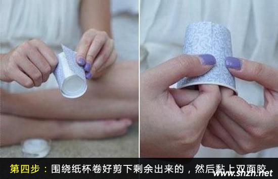 第四步,用裝飾紙量度好杯子的周長,把多出來的剩余包裝紙剪去。然后再撕開雙面膠,在一次性紙杯上黏上包裝紙。