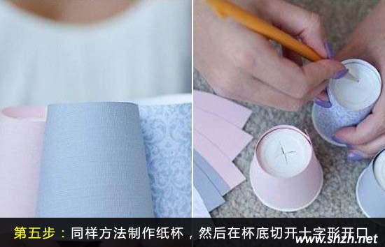 第五步,用同樣的方法為剩下的其他一次性紙杯卷上各式各樣的包裝紙。然后反轉杯子,在杯底處畫上橫豎大概2.5cm的十字型,再一個個用小刀割開。(注意這里的十字口不能割開太大,否則**燈泡的時候,杯子則容易脫落哦)