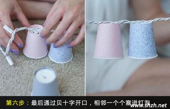 第六步,最后,準備好足夠的杯子之后,拿出購買的彩燈條,把其中的燈泡一個個一個個依次地通過割開來的十字刀口塞進一次性杯子里面。