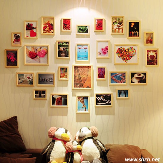心形,愛意濃濃,裝飾在新婚小夫妻的婚房,會給空間帶來更多的愛意。大小不一的照片,裝飾淡木色的相框,色彩亮麗的照片拼湊在一起,更顯小夫妻的甜蜜愛情。圖片中,各種愛的象征,糖果拼湊的心形,或者“LOVE”的標示,無處不透出濃濃的愛意,浪漫無比。
