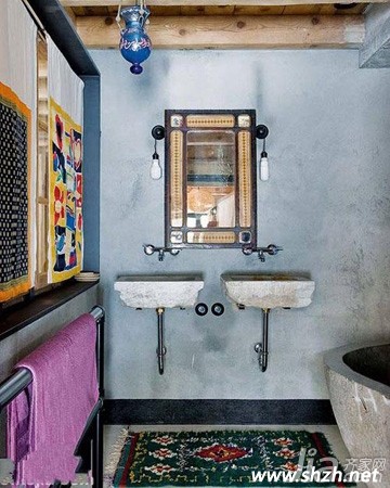 衛(wèi)浴間沒(méi)有繼續(xù)使用實(shí)木的材質(zhì),而是在吊燈上保留原木的同時(shí)使用了水泥的墻面,但是完**露的墻面以及顏色鮮艷的地毯都將整個(gè)空間渲染的個(gè)性十足。