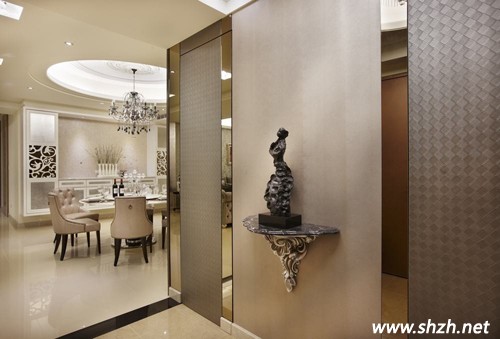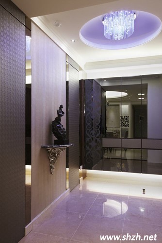 先看玄關(guān)的設(shè)計(jì)吧,設(shè)計(jì)師巧妙運(yùn)用多種材質(zhì)的混搭。不同材質(zhì)的注入,有混搭木、石、皮革等,再配上柔和的紫色燈光,各種材質(zhì)打造的裝飾物都能成為玄關(guān)亮麗的一道風(fēng)景。