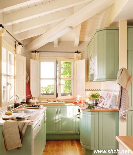 巧妙之處在于在轉(zhuǎn)角處打造了兩個(gè)不同造型的收納櫥柜。一個(gè)是設(shè)置了柜門,另一個(gè)則打造成格子狀,擺放經(jīng)常使用的瓶瓶罐罐,拿取也是非常方便的。并且以嫩綠色和原木色相間的整體櫥柜也能給小小的廚房帶來(lái)一抹清涼的感受。各種烹飪工具及廚房用具都干凈整齊的擺放在櫥柜上,不凌亂且能帶來(lái)美觀的效果。