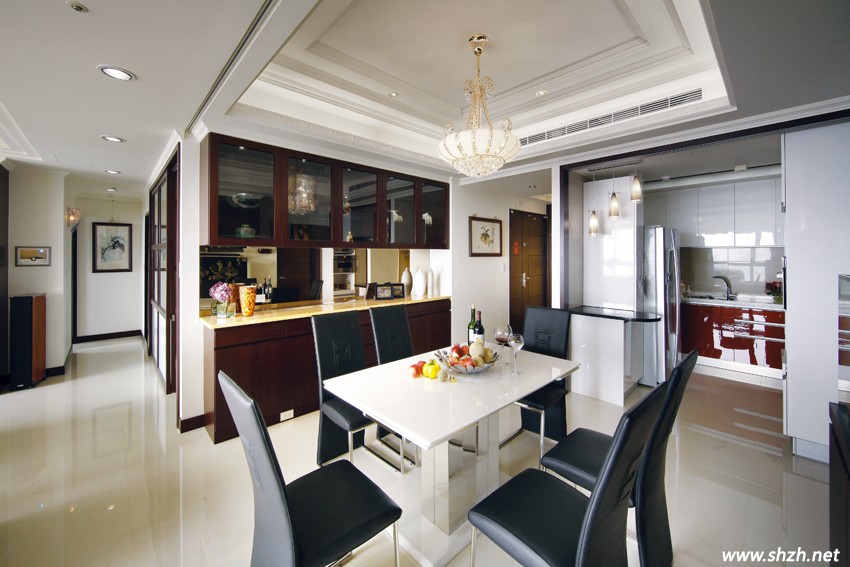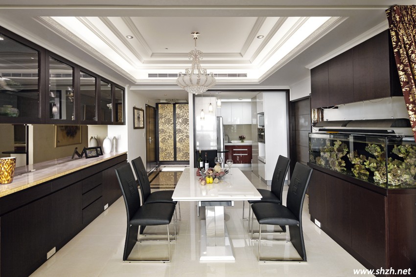 玄關(guān)與客廳之間為餐廳、廚房所在區(qū)域,洗煉的黑色皮革餐椅搭配光芒四射的水晶燈飾,餐桌兩側(cè)分別是氣勢(shì)不凡的餐柜與生機(jī)盎然的水族端景柜設(shè)計(jì),透過(guò)線條的等比塊面分割,打造出長(zhǎng)列延展的上、下餐柜,除了滿足公共空間充分的儲(chǔ)物需求外,柜體中段還搭配茶鏡襯底,加上黃玉石特制的透光臺(tái)面,煥發(fā)廳內(nèi)美輪美奐的繽紛光影。餐廳上方對(duì)應(yīng)餐桌椅的天花造型,漸進(jìn)的落差有效提升高度感,透過(guò)層板燈光加強(qiáng)效果,精致的線條層次展現(xiàn)施作上的專業(yè)水平。一旁的半開(kāi)放廚房隔著刻意加大的木框門(mén)拱、小巧吧臺(tái)與餐廳相鄰,除了一字形的料理工作區(qū),體貼的設(shè)計(jì)師還在廚房過(guò)道兩邊規(guī)劃便利的家電柜與食物柜,增加用餐時(shí)的生活情趣。