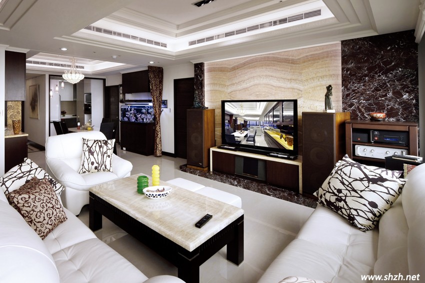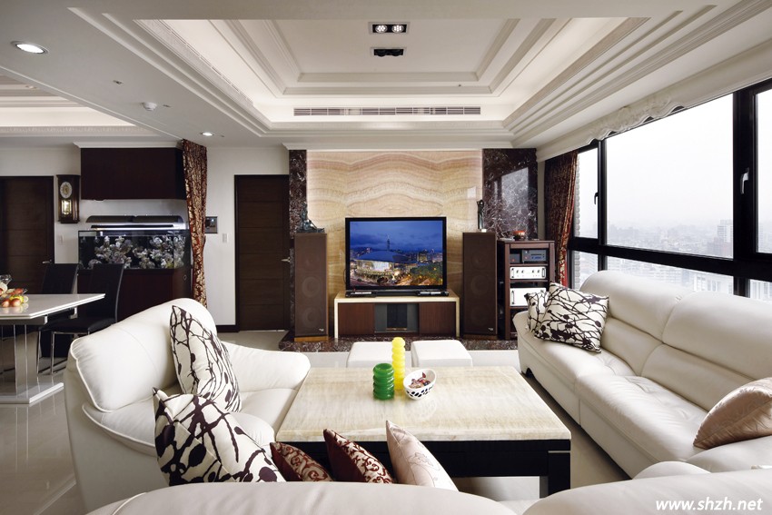 氣勢(shì)十足的公共空間為開(kāi)放式規(guī)劃,客廳擺設(shè)著比例和諧、質(zhì)型俱佳的白色皮革訂制家具,視覺(jué)上不以制式的裝置元素切割平面,反而以更圓融純熟的手法營(yíng)造連續(xù)面的整體美。氣勢(shì)恢弘的電視主墻中央同樣精選稀有的天然玉石精工打造,華麗而細(xì)膩的對(duì)花紋理,本身就是令人嘆為觀止的裝置藝術(shù),兩側(cè)搭配氣質(zhì)沉穩(wěn)的深金峰石材,運(yùn)用色彩的深淺對(duì)比加強(qiáng)大面積量體的變化。避免繁復(fù)的裝飾線條喧賓奪主,僅在連續(xù)的落地大窗前方點(diǎn)綴局部藝術(shù)線板,帶出新古典特有的優(yōu)雅因子。