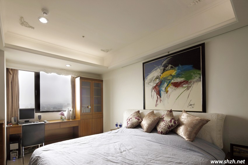 家中的收納是整體規(guī)劃不可或缺的重要項(xiàng)目,全案裝修過(guò)程也因?yàn)闄还窦揖呋淖龇ㄊ∠虏簧贂r(shí)間與金錢(qián),基于事前精準(zhǔn)的丈量,讓這些在工廠制作的系統(tǒng)櫥柜,可以在完成之后再運(yùn)至現(xiàn)場(chǎng)搭配精致木作收邊來(lái)組裝,同時(shí)也因?qū)I(yè)工廠無(wú)塵的要求更高而倍增質(zhì)感,更重要的是大大降低施作現(xiàn)場(chǎng)的污染,可說(shuō)是一舉數(shù)得,特別像是主臥室床側(cè)雅致的大型白色高柜,以及床頭后方附設(shè)更衣間內(nèi)并列的兩側(cè)衣柜和梳妝臺(tái),都是優(yōu)質(zhì)系統(tǒng)櫥柜搭配部份木作的精彩示范。床頭格外精致的立面勾縫造型,經(jīng)由溫暖潤(rùn)澤的實(shí)木紋理,烘托線條等比分割的簡(jiǎn)潔造型,清新淡雅的色彩布局,大大提升私密空間的舒適度。