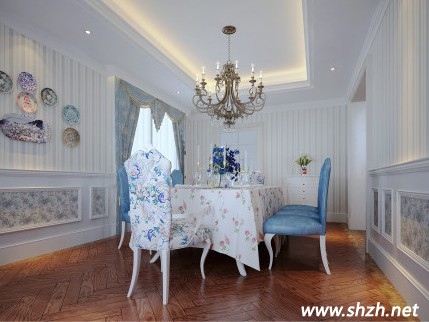 餐桌那是家人一天工作后吃飯的地方,白色的墻壁給人干凈透明的感覺,藍(lán)色碎花的窗簾,加上紅色碎花的桌布在這純白色的空間里給我們別樣的小清新。墻上五彩斑斕的裝飾有種異域風(fēng)情。