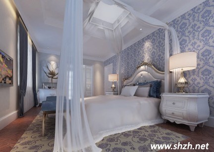 白色的蚊帳飄逸著,墻紙上藍(lán)色的花紋,兩者相互融合不真是藍(lán)天白云的景象。一臺金屬底座的臺燈并沒有打破著和諧,反而增加了更深一層的味道。并且使用一些油畫裝飾,花紋裝飾讓臥室變得更加溫馨。