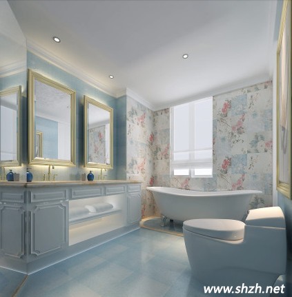 衛(wèi)生間就是很簡單的英式風(fēng)格,在墻上依然使用的是碎花壁紙,淡藍(lán)色的瓷磚,與衛(wèi)生間整體白色一致,為了不使整個(gè)衛(wèi)生間看的過于單一,而將鏡子周邊鑲上金色的邊框彰顯英式的貴族氣息。