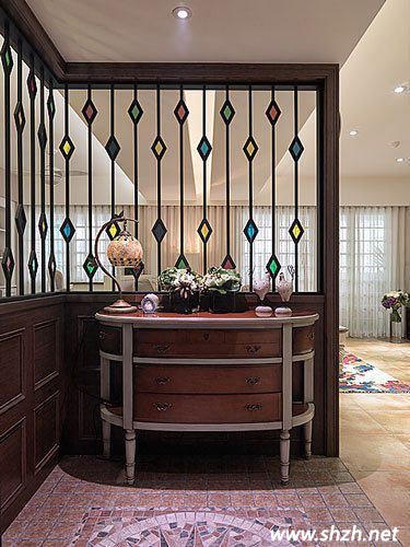 進(jìn)門就用玄關(guān)將入戶處與客廳隔開,木質(zhì)的玄關(guān)上鑲上上透明的玻璃,讓客廳采光效果更加,復(fù)古的木質(zhì)桌椅,擺上歐式臺(tái)燈,看的出房屋主人對(duì)玄關(guān)處設(shè)計(jì)的用心,加上玻璃上五顏六色的菱形彩繪玻璃塊,讓室內(nèi)增添一股時(shí)尚。