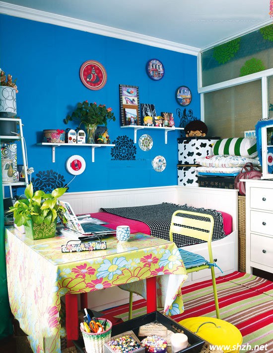 一張簡(jiǎn)小幽雅的沙發(fā)床,潔白的沙發(fā)上搭配鮮艷的沙發(fā)墊,加上整個(gè)深藍(lán)色的背景墻,整體會(huì)讓狹小的空間很亮麗略帶一點(diǎn)奢華之感,而且層次也很鮮明。墻上,沙發(fā)周圍,桌子上各式有著各樣色彩艷麗的布藝裝飾和帶有民族特色裝飾物點(diǎn)綴,讓整個(gè)空間都活躍起來(lái),別是一番風(fēng)情。