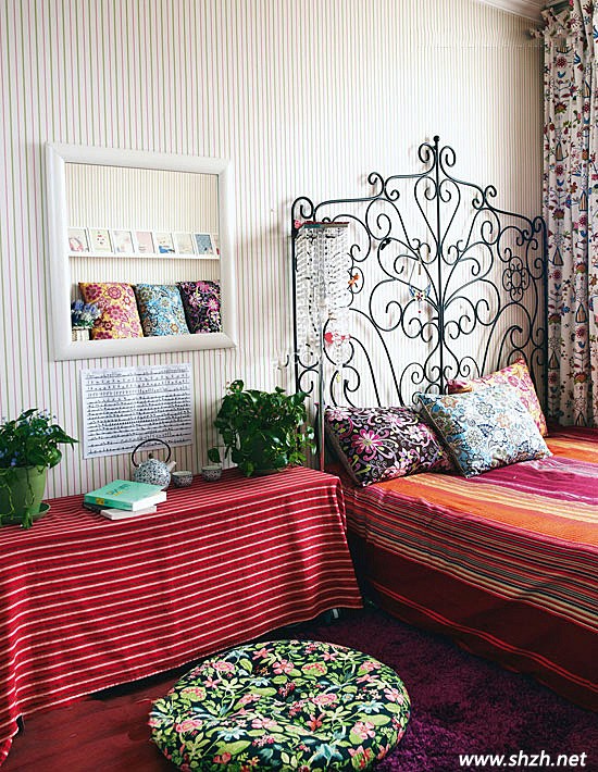 最后看看小臥室的風(fēng)情吧,藤條形狀的銅藝床頭,床上,地板,床頭柜的顏色都控制在深色系當(dāng)中,再用稍微淡的墻壁顏色調(diào)和整體感覺(jué)。不管墻壁,床單,還是床頭柜上的蓋布都是條紋相間。讓人眼花繚亂,既有現(xiàn)代感,又有雨林的天然感。