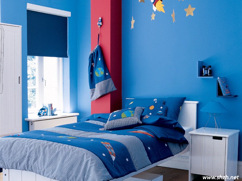 只有純真無邪的孩子才能配得上如此藍(lán)色星空夢幻般的房間,在這房間里,孩子會神清氣爽,充滿活力。低調(diào)而養(yǎng)眼的背景色與床單相應(yīng),床單上可愛的卡通圖案將可愛全部烘托出。就連窗簾也全部選用純藍(lán)色,讓孩子暢游在寶石藍(lán)般的幻想中。