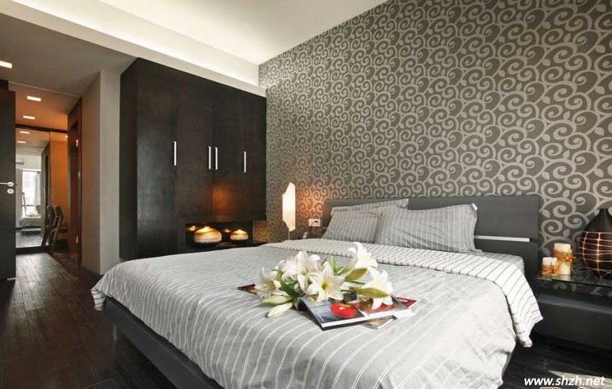 灰色的花紋壁紙裝點(diǎn)臥室,顯得格外有趣,灰色的軟床以及灰白的床單,顏色分明。房間的鋪設(shè)簡單,但是卻疏密有致,古板的壁櫥和灰色正好搭配。低調(diào)含蓄的色彩與簡單裝飾的家具共同撰寫臥室的玲瓏魅力。