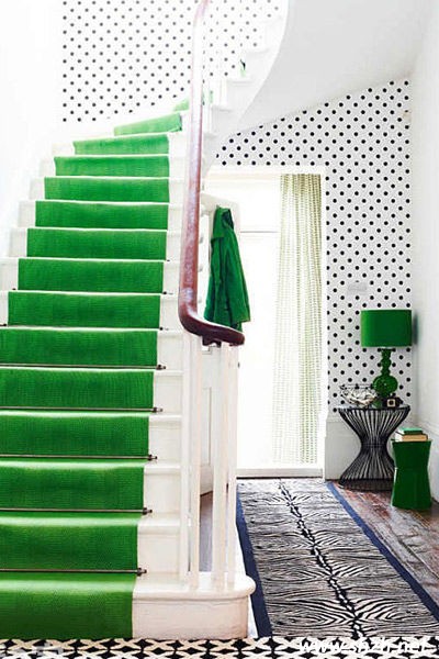 看完淺色系地毯的簡約時尚,再讓你感受鮮艷的純色系帶來的視覺感受。綠色的樓梯地毯瀑布傾盆而下,加上室內的綠色裝飾搭配,滿屋子的綠色讓人身輕氣爽,呈現出一種別樣的浪漫。
